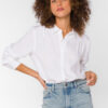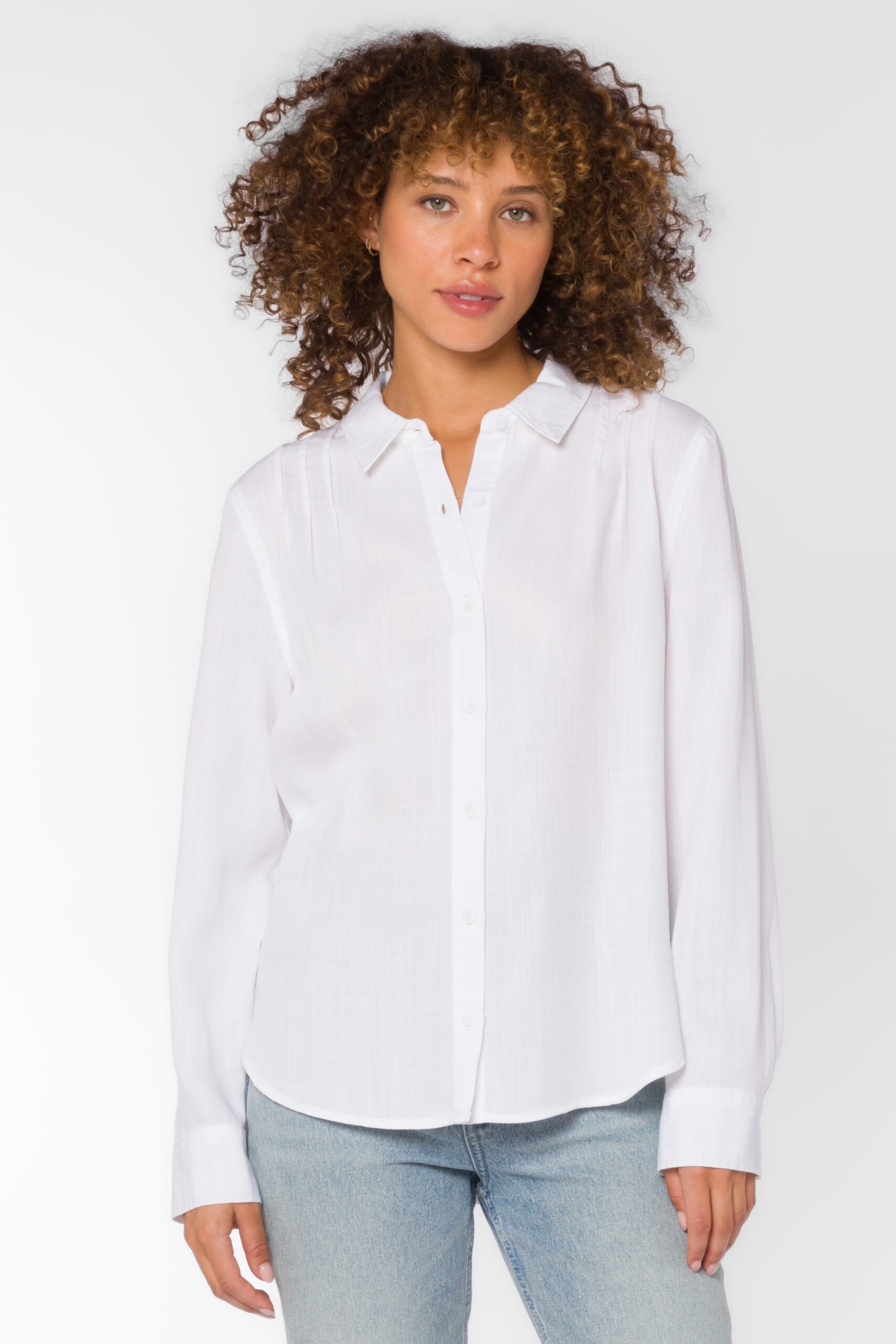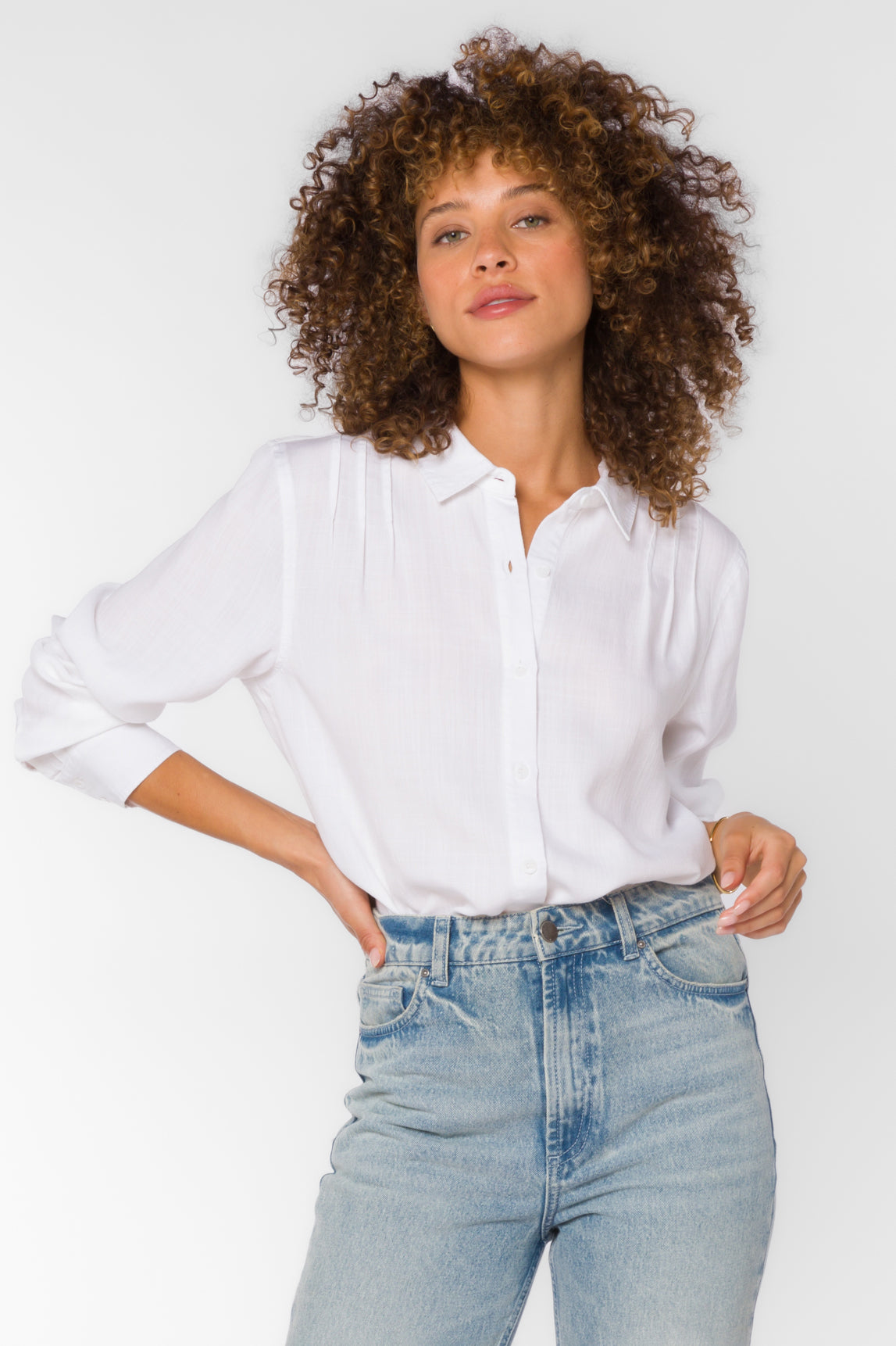 The blouse is our sustainable button-up, with pintuck shoulder detailing and long button-cuffed sleeves.