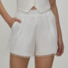 Impeccably tailored with a high-waisted silhouette, these offer both comfort and style. The high-rise design cinches at the waist, accentuating your natural curves and creating a flattering hourglass shape. Perfect for elongating the legs, these shorts are versatile enough to transition seamlessly from day to night. Adorned with intricate lace trim detailing, these shorts add a touch of romance to any ensemble.